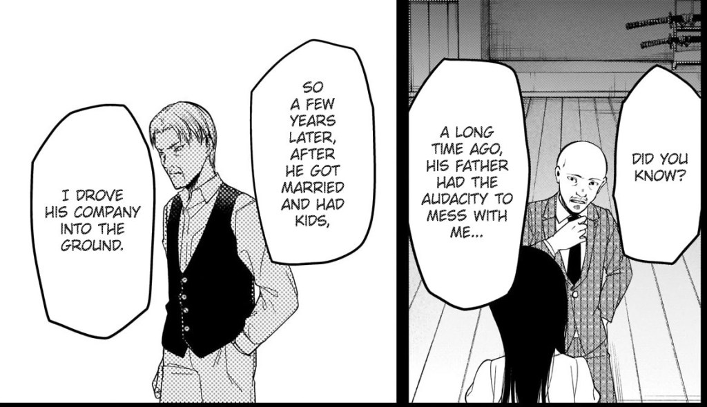 Those might not be exactly the questions you had, but I think you’d agree the beef is an interesting and pivotal story to tell. Combined with the divorce (since you can’t really talk about one without talking about the other), 14 chapters might be enough, but as we’ll see this isn’t the only thing Aka needs to worry about.